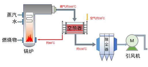 防堵抗蝕復合管空氣預熱器布置在鍋爐尾部煙道,利用煙氣余熱加熱進爐空氣。其主要應用在末級低溫段煙氣處,煙氣由約160℃降溫至約100℃,空氣由約30℃升溫至約80℃。防堵抗蝕復合管空氣預熱器(FAH)替換其他材質空預器,能有效解決或減輕因超低排放導致的銨鹽結晶以及生物質、摻燒污泥鍋爐高含濕煙氣的腐蝕、積灰堵塞問題。